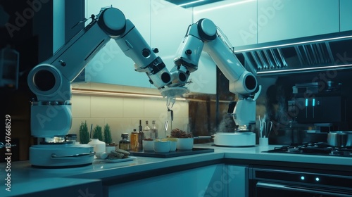 Futuristic automated kitchen with robotic arms preparing food in a modern style