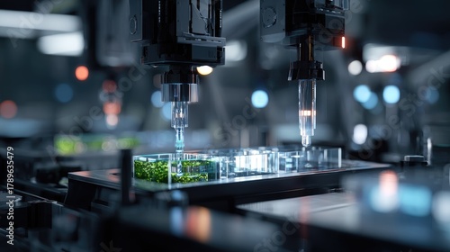 Futuristic automated lab equipment injecting samples into microplates