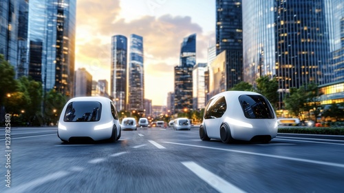 Futuristic Autonomous Vehicles Driving Through Modern City at Sunset