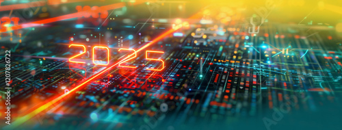 Futuristic banner concept with glowing neon lights of numbers 2025, digital space background, modern aesthetic of new technology.