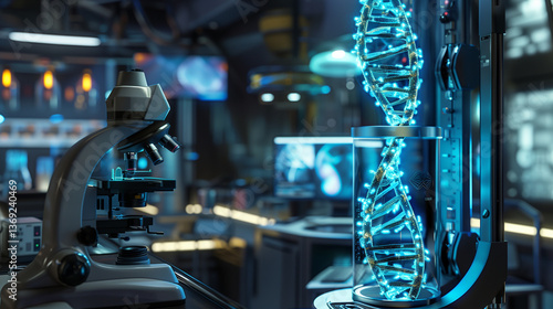 futuristic biology lab featuring microscope and holographic DNA strand, showcasing advanced scientific research and innovation