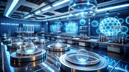 Futuristic biotech lab with glowing petri dishes and holographic molecular models