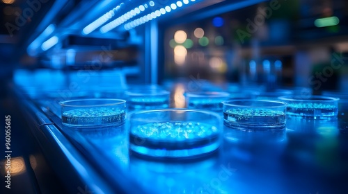 Futuristic Biotech Lab with Rows of Glowing Petri Dishes Illuminated in Blue