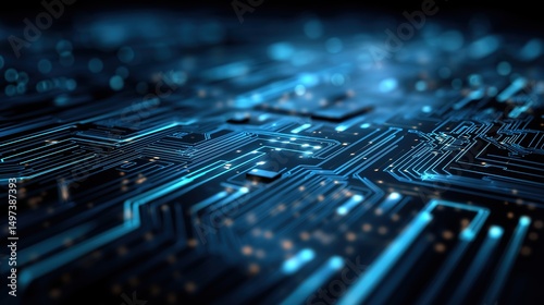 Futuristic blue circuit lines on geometric tech background, symbolizing digital innovation and advanced technology