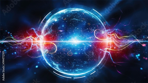 Futuristic blue energy sphere featuring high-tech light effects, digital elements, and vibrant energy particles. Abstract cosmic background.
