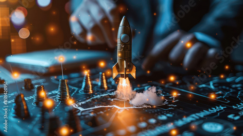 Futuristic board game scene with a glowing rocket launching, surrounded by hands and strategy pieces, representing innovation and planning.