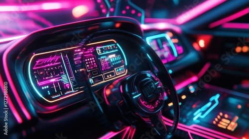 Futuristic car interior featuring vibrant neon lights and advanced digital dashboard displays