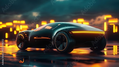 futuristic car look like spaceship hover fast moving on the road with neon light and buildings, cyber city,