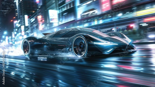 Futuristic car speeding through neon lit city streets