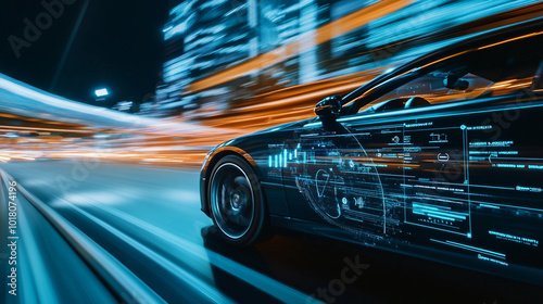 Futuristic Car with Advanced Technology Displaying Digital Information on a Night Drive