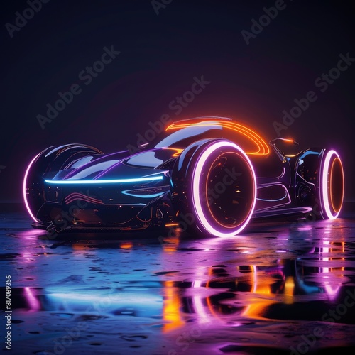 Futuristic car with sleek design and neon accents, glowing in a dark, reflective setting.