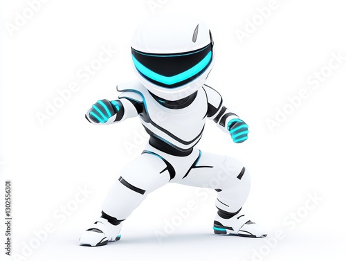 Futuristic cartoon character in dynamic pose, showcasing agility in a minimalist setting