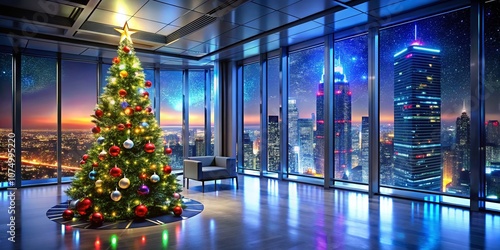 Futuristic Christmas Tree in High-Tech Office Cityscape
