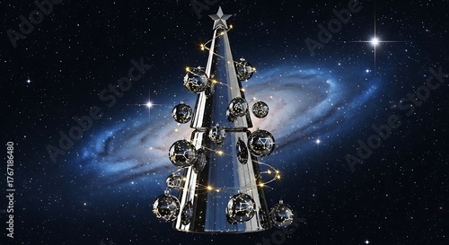 Futuristic christmas tree with ornaments and lights against a galaxy backdrop in a space scene