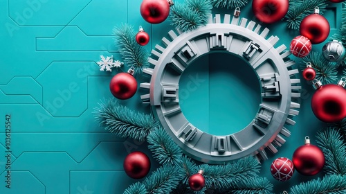 Futuristic Christmas wreath with ornaments on tech-inspired background, modern holiday design