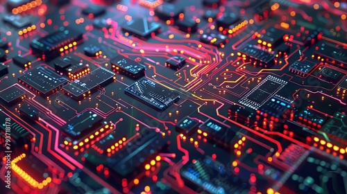Futuristic circuit board design with AI chips and neural processing units, illustrating the computational architecture of intelligent systems
