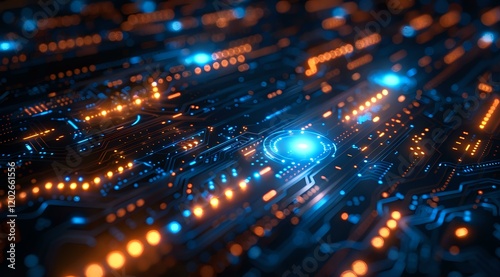 Futuristic circuit board with glowing blue and orange lights creating depth effect, perfect for technology and innovation concepts in web design and presentations.
