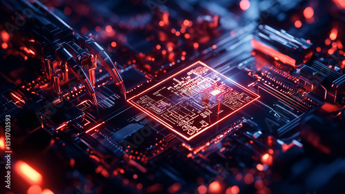 Futuristic circuit board with glowing components and robotic arms. intricate design showcases advanced technology and vibrant colors, creating captivating visual experience