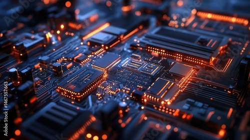 Futuristic circuit board with glowing components in dark setting