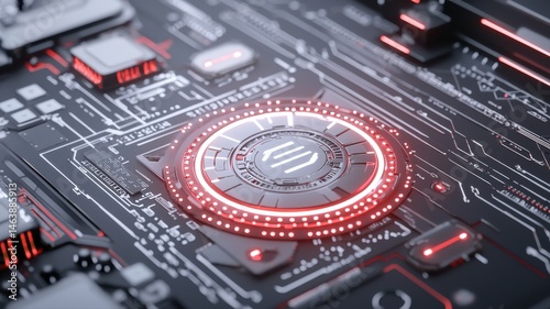 Futuristic Circuit Board with Red Glowing Lights and Processor Detail processor futuristic glowing