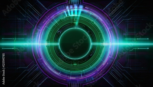 futuristic circular abstract design with vibrant green and purple lights illuminating a dark background. It creates an atmosphere of advanced technology, innovation, and potential.