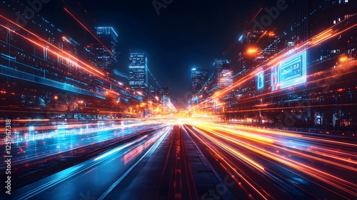 Futuristic city at night, glowing with neon and holograms, exuding high-tech energy. Ideal for ads, tech content, cyberpunk games, or articles on smart cities' future.