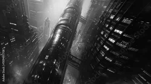 Futuristic city, monochrome, aerial view, towering structures, industrial, dystopian, cyberpunk.