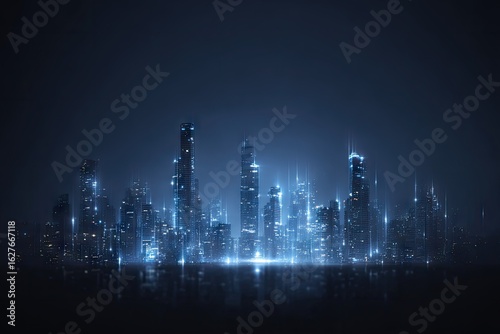 Futuristic city skyline at night, illuminated with blue light.