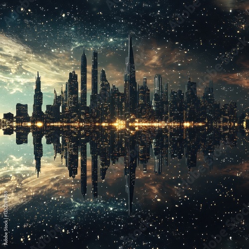 Futuristic City Skyline Reflected in a Shimmering Body of Water
