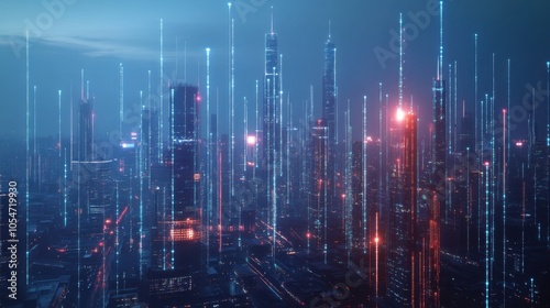 Futuristic city skyline with glowing lines and dots, representing Generative AI networks