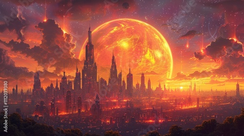 Futuristic city skyline with glowing red planet in the background, fiery sky and clouds. AI generative. .