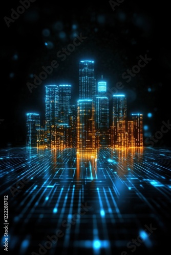 Futuristic city skyline with neon lights.