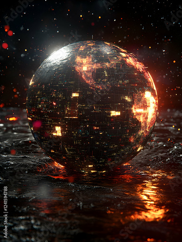 Futuristic city sphere on fiery planet, space background, sci-fi concept art