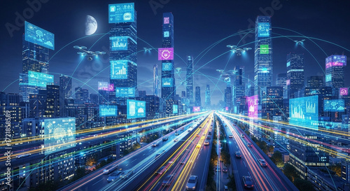 Futuristic city with digital information interface, smart technology, and communication network, showcasing innovation and connectivity