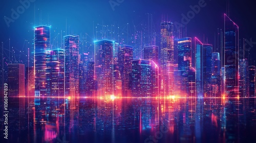 Futuristic Cityscape at Night with Luminous Skyscrapers, Neon Lights, and Reflections in Calm Water, Representing Modern Technology and Urban Life