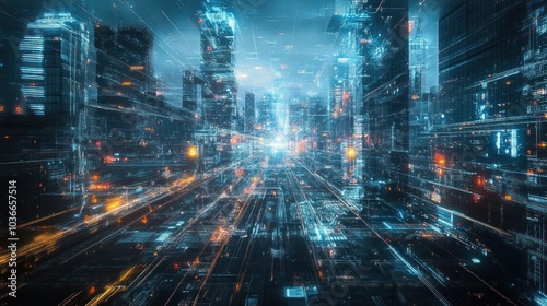 Futuristic Cityscape at Night with Neon Lights and Digital Artwork