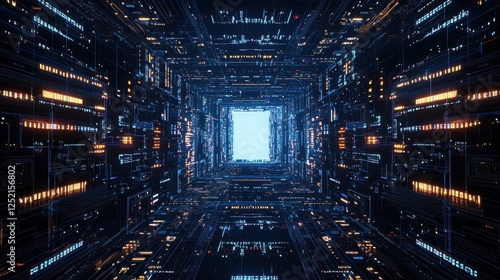 Futuristic cityscape at night with vibrant lights illuminating modern buildings and streets