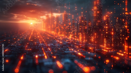 Futuristic cityscape at sunset with glowing lights, representing advanced technology and digital innovation.