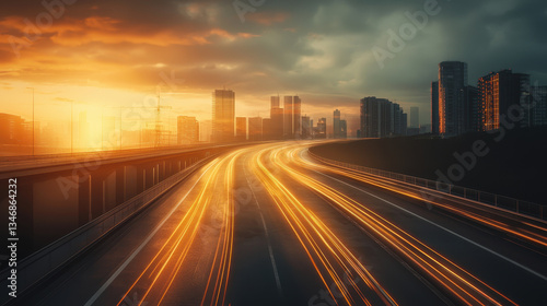 futuristic cityscape at sunset with light trails on highway, creating dynamic and vibrant atmosphere