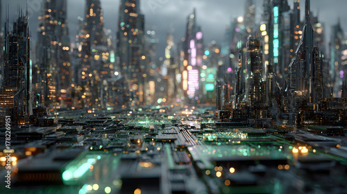 Futuristic Cityscape: Digital Construction Rising from Circuit Board Foundations