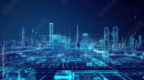 futuristic cityscape is depicted with digital twin technology, showcasing network of AI powered simulations and glowing blue lines representing data flow