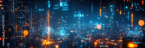 Futuristic Cityscape: Neon Lights and Digital Data Streams