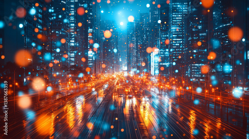 Futuristic cityscape night scene with abstract blue orange bokeh lights