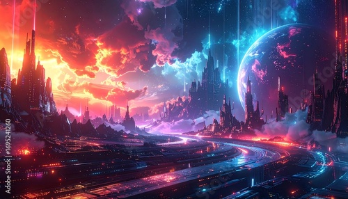 Futuristic cityscape under vibrant skies