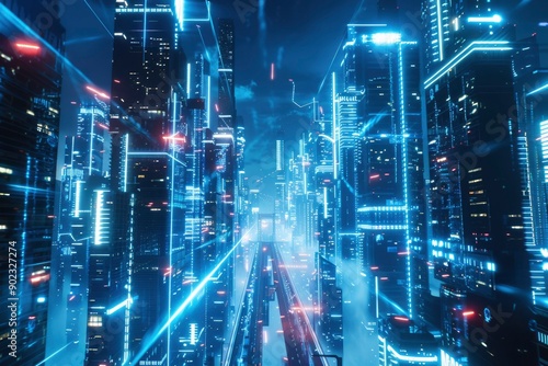 Futuristic Cityscape with Glowing Blue Lines and Red Lights