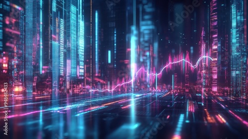 Futuristic cityscape with glowing data lines, showcasing technology and digital innovation in a vibrant, neon environment.