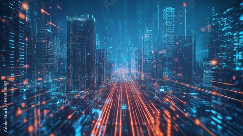 Futuristic cityscape with glowing lights and digital data streams, representing technology, innovation, and urban advancement.
