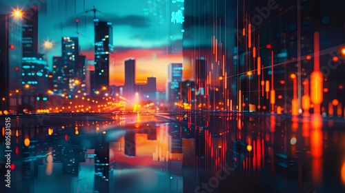 Futuristic cityscape with glowing neon lights and reflections