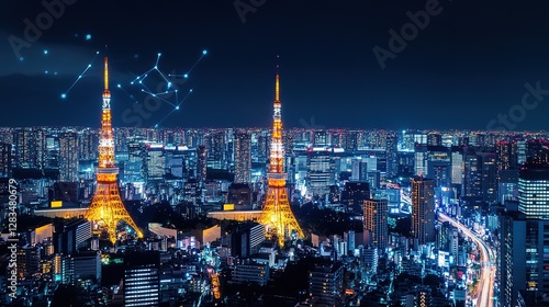 Futuristic cityscape with glowing structures and digital pathways, showcasing advanced urban innovation
