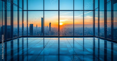 Futuristic cityscape with modern glass buildings, blue gradient tones, and reflections of skyline